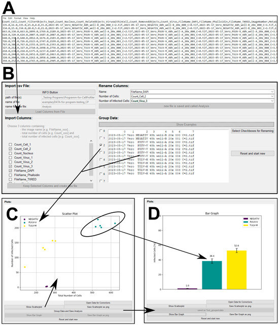 Custom software tool for processing CellProfiler output. (A) An exemplary csv file as a result of using CellProfiler to quantify PUUV and/or TULV infection after 48 h. (B) Graphical user interface (GUI) of the software that allows for the processing of csv files. The software tool summarizes and groups’ important data columns based on the image name to obtain visual output in the form of scatterplots (C) or bar graphs (D).