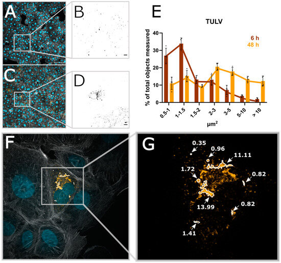Automated image analysis allows for the extraction of structural parameters. (A) A micrograph taken with 20× magnification of Vero E6 cells infected with TULV 6 h post-infection. (B) The viral N protein; scale bar = 10 µm. (C,D) The 48 h post-infection time point of TULV infection. (E) The size of TULV-N segmented particles at either 6 h or 48 h post-infection. (F) A 100× magnification of 48 hpi TULV-infected Vero E6 cells, (G) Exemplary TULV-N structures and the correlating size.
