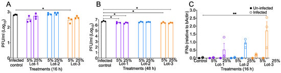 In order to examine if acAF has antiviral properties, we assessed SARS-CoV-2 titers in acAF-treated A549-hACE2 cells. In these studies, we used the same acAF lots previously tested (in the above section), each at 5% and 25% concentrations. A549-hACE2 cells were infected with SARS-CoV-2 (0.1 MOI), and cell supernatants collected at 16 h and 48 h post-infection were used to titer on VeroE-hACE2 cells. DMEM-2% (D-2) was used as the control medium for infection studies. Our virus titer assays showed an approximately two–three-fold reduction in SARS-CoV-2 titers in lot 3 (5%) at 16 h post-infection, and in lot 1 (5% and 25%) and lot 3 (5% and 25%), at 48 h post-infection in acAF-treated cells when compared to the control D-2-treated cells (Figure 2A,B). These results demonstrate that acAF suppresses SARS-CoV-2 infection in A549-hACE2 cells. Next, we evaluated whether acAF suppresses virus replication through the robust induction of antiviral cytokines. A549-hACE2 cells were pre-treated for 2 h with different lots of acAF at concentrations of 5% and 25%. The cells were then infected with a 0.1 MOI dose of wild-type (WT) SARS-CoV-2. At 16 h post-infection, the cells were lysed with a Trizol reagent to isolate RNA and prepare cDNA, followed by qPCR for estimating the mRNA levels of antiviral genes. We found that the treatment with lot 3 (25%) caused a significant increase in anti-viral (IFNβ) mRNA levels (Figure 2C) at 16 h post-infection. These results suggest that acAF-induced anti-viral IFN effects suppress SARS-CoV-2 infection in lung epithelial (A549-hACE2) cells.