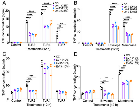 RAW 264.7 macrophage cell lines were seeded in a 48-well plate, and a confluent monolayer of cells was pre-treated for 2 h with 3 different lots of acAF and AF-EVs at concentrations of 25% v/v and 10% v/v, respectively, in 1 mL solutions. Following treatment, the cells were stimulated with Toll-like receptor agonists PAM3CSK4 (TLR1/2 agonist, InvivoGen, catalog # vac-pms) at 1 µg/mL, LPS (TLR4 agonist, InvivoGen, catalog # tlrl-smlps) at 100 ng/mL, and R837 (TLR7 agonist, InvivoGen, catalog # tlrl-imq) at 1 µg/mL. In another study, acAF-treated RAW 264.7 macrophages were stimulated with recombinant SARS-CoV-2 structural proteins—spike (S) at 5 µg/mL (BEI Resources, catalog #NR52397), envelope (E) at 0.5 µg/mL (ABclonal, catalog # RP01263LQ), and membrane (M) at 1 µg/mL (M, Abcam, catalog # 48951) proteins for 12 h. The collected supernatant was diluted to 1:32 followed by cytokine estimation using an ELISA. The Mouse TNF ELISA Set II (BD OptEIA, catalog # 558534) was used for performing the TNF ELISA.
