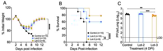 Given the ability of acAF to suppress inflammatory cytokine production, we then examined the protective role of acAF in 10–15-week-old female BALB/C mice treated with two different lots of acAF (lots 2 and 3) and infected with MA-CoV-2. acAF lots 2 and 3 were selected because of their superior efficacy in reducing inflammatory cytokines and viral replication in vitro, as shown in Figure 3A,B. To assess the role of acAF in host protection, we injected 10–15-week-old mice intraperitoneally (I.P.) with the selected lots of acAF at 0 and 2 days post-infection (DPI) at a concentration of 200 µL (100 µL acAF + 100 µL PBS)/mouse. An equal amount (200 µL) of 1× phosphate-buffered saline (PBS) was injected I.P in the control mice. The control PBS- and acAF-treated mice were infected with 250 PFUs/mouse of MA-CoV-2 intranasally (I.N.) in 50 µL of DMEM. We found that the mice treated with both lots of acAF initially lost around 15% of their body weight and then started gaining weight from day 6 post-infection, whereas the control PBS-treated mice lost more than 25% of their body weight and all mice in this group succumbed to infection by day 7 post-infection (Figure 4A). The body weight loss was lower in the lot 2 and lot 3 acAF-treated mice compared to the control PBS-treated mice at the 6 DPI time-point (Figure 4A). The acAF-treated mice recovered almost 90% of their initial body weight by 12 DPI. Additionally, 60% of the lot 2-treated mice and 80% of the lot 3-treated mice survived to 8 DPI compared to the 100% mortality observed in the control PBS-treated mice by 7 DPI (Figure 4B). Next, to test whether the acAF treatment would reduce SARS-CoV-2 titers in the lungs, we examined the virus titers in the control and acAF-treated lungs at 4 dpi. Our results showed that the lot 3 acAF-treated mice had a two-fold reduction in viral titers compared to the control and lot 2 acAF-treated mice (Figure 4C). From these results, we conclude that acAF lot 3 is more effective as a therapeutic than lot 2. Collectively, these results demonstrate the protective immunomodulatory and anti-viral properties of acAF against MA-CoV-2 infection, as well as the ability of acAF to moderately suppress viral titers in MA-CoV-2-infected mice lungs and improve survival rates.