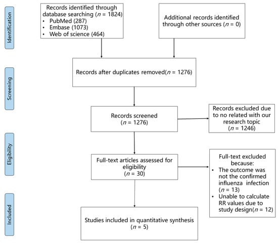 A total of 1824 records were yielded through our search strategy. After preliminary selection and removal of duplicates, full texts of 30 articles were thoroughly reviewed. After a thorough review, 13 articles were excluded because their outcomes were not consistent regarding confirmed influenza virus infection, and 12 articles were eliminated due to an uncomputable RR value. Finally, five articles [,,,,] were included in our meta-analysis. The flowchart of literature screening is shown in Figure 1. Among these included studies, 1,472,239 statins users and 1,486,881 statins non-users from three countries (Canada, Australia, and the USA) were observed for the outcome of nucleic acid detection or rapid diagnostic tests for influenza (Table 1). Two articles (Chung [] and Izurieta []) only selected older people (aged >65/66 years old) as participants, and the other three articles included young people as participants. The earliest study we included was conducted during the 2004–2005 influenza season, and the most recent one was conducted during the 2018–2019 influenza season. Three articles were cohort studies, which allowed us to directly calculate RR values. Although two articles were termed as case-control/test-negative studies, we could still indirectly calculate RR values because they were all prospective designs. All included studies had good or satisfactory quality as assessed by the Newcastle–Ottawa Quality Assessment Scale. Details of the quality assessment can be found in Supplementary Tables S1 and S2.