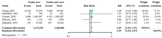 The influenza incidence from each of the above five studies was extracted, and then we synthesized the risk ratio (RR) of influenza infection in statins users compared to that of statins non-users. As shown in Figure 2, the pooled RR of influenza infection by analyzing with both the fixed effect model and the random effect model was significantly higher in statins users than it was in statins non-users (RR = 1.05, 95% CI: 1.03–1.07), suggesting that statins administration might increase the risk of confirmed influenza infection. The sensitivity analysis indicated that the overall pooled RR was robust (Supplementary Figure S1). Additinally, Egger’s and Begg’s tests showed that publication bias had a small influence on the pooled result (t = −0.25, p = 0.819 by Egger’s test; z = 0.24, p = 0.807 by Begg’s test, Supplementary Figure S2).