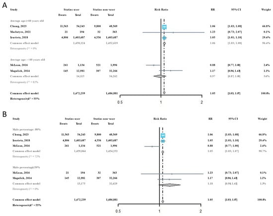 Considering that age and sex are important influencing factors for virus susceptibility, all included studies were subsequently classified according to the average age and female percentage of participants. Among participants with an average age ≥ 60 years, we found that the risk of influenza infection in statins users was significantly higher than it was in statins non-users (RR = 1.06, 95% CI: 1.03–1.08), but this phenomenon was not observed among participants with an average age < 60 years (RR = 0.97, 95% CI: 0.87–1.09) (Figure 3A). For participant groups with a higher percentage of females, the risk of influenza infection in statins users was significantly higher than it was in statins non-users (RR = 1.05, 95% CI: 1.03–1.07), but the RR in participant groups with a higher percentage of males showed no significance differences between statins users and statins non-users (Figure 3B).