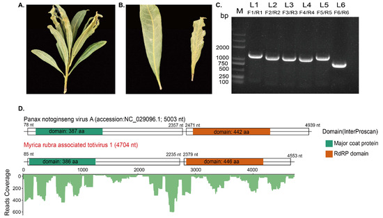 To investigate potentially causing pathogens, the leaves of the Chinese bayberry tree (Myrica rubra) exhibiting chlorotic and notched leaf edge symptoms were collected and recorded (Figure 1A,B). Leaves showing disease symptoms were ground in liquid nitrogen and used to extract the total RNAs for metatranscriptome sequencing. Before transcriptome sequencing, ribosome-RNAs were depleted from the sample. The rRNA-depleted total RNA sequencing produced a total of 99,450,902 raw reads. Following quality control procedures, 98,298,500 clean reads were retained and subjected to the de novo assembly. After the de novo assembly process and removal of the redundancy contigs, 200,274 contigs were retained for the downstream analysis (max length: 16,236 bp, min length: 200 bp, N50: 635 bp). The assembled sequences obtained from the de novo assembly were subjected to the BLASTx search against the NCBI NR database to identify the potential viral contigs. As a result, two protein sequences deduced from the assembled sequence are found to be annotated with viruses within the family Totiviridae with a credible similarity. Interestingly, when the corresponding viral contigs were subjected to a BLASTn search in the NCBI NT database, no significant matches or similarities were found at the nucleotide level, suggesting that these contigs may represent the novel viral sequence.