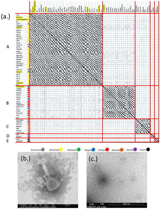 (a) Whole genome dot plot analysis of 61 Vi01-like phages reveals five subclusters of related phages within the Enterobacteriaceae Ackermannviridae family, with host (indicated in the colored circles) associating with subcluster designation. Yellow highlighted phages were discovered in our lab. The dot plot was constructed using a locally installed version of Gepard at default settings with whole genome nucleotide sequences as the input files. Default settings are defined in Krumsiek et al., 2007 [86]. (b) Guerrero as imaged by electron microscopy. (c) AR2819 as imaged by electron microscopy.