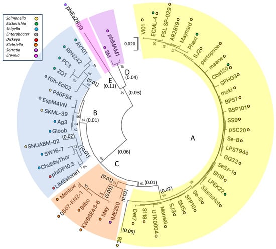 A phylogenetic tree was produced using the major capsid protein of 150 of the Vi01-like Enterobacteriaceae phages on NCBI [87,96,97,98,99]. This is represented in Figure 2, which has been labeled using the subclusters (A–E) identified by the dot plot and ANI analysis above. Phage MCPs appeared to be most similar to orthologous genes in their same subclusters, verifying the subcluster designations made by dot plot and ANI and suggesting little homologous recombination of MCP’s between subcluster, perhaps due to the differences between hosts associated with each subcluster [16]. The MCP phylogenetic tree also suggests that the A,B,C evolved from a common progenitor and diverged from D,E, which has a more shallow branch point.