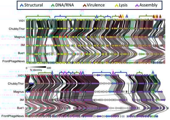 Due to the high genomic similarity within each subcluster, one phage was selected from each subcluster to be the basis of further genomic comparison: namely Vi01 (A), ChubbyThor (B), Magnus (C), 3M (D), and Bue1 (E) [19,73,94]. A summary of the characteristics of these phages is provided in Table 3.
