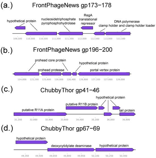 Four operons identified in Vi01-like Ackermannviridae phages FrontPhageNews and ChubbyThor suggest putative pathways for protein function. (a) Describes an operon in FrontPhageNews that implies that hypothetical proteins gp173 and 174 are likely involved in DNA polymerase assembly. (b) Describes an operon in FrontPhageNews that indicates that hypothetical protein gp199 is involved in phage head structure. (c) Describes an operon in ChubbyThor that suggests that hypothetical proteins gp43, 44, and 45 are involved in lysis inhibition. (d) Describes an operon in ChubbyThor that indicates that hypothetical proteins gp67 and 69 may encode DNA repair proteins.