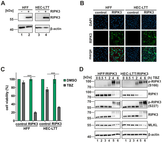Generation of a necroptosis-sensitive cell culture model. (A) HFF and HEC-LTT cells were lentivirally transduced to stably express RIPK3. Successful integration of RIPK3 was monitored in Western blot analysis. (B) Expression of RIPK3 was analyzed by indirect immunofluorescence analysis. Cell nuclei were stained with DAPI. Scale bar, 100 µm. (C) The sensitivity of RIPK3 expressing cells to necroptosis was analyzed in a cell viability assay by monitoring intracellular ATP levels (CellTiter-Glo, Promega, Fitchburg, MA, USA). The cells were stimulated for 8 h with TBZ (TNFα (30 ng/mL), BV-6 (5 µM) and z-VAD-fmk (25 µM)). Green, DMSO-treated cells; grey, TBZ treated cells. Depicted values represent the means +/− SD derived from triplicates relative to control cells (%). (D) The modulation of the necrosome components after the indicated times of TBZ treatment was monitored in Western blot analysis. Β-actin served as internal loading control. Each experiment was performed three times in independent experiments and one representative experiment is shown. For statistical analysis a student’s t-test was performed (unpaired, two-tailed); *** p < 0.001.