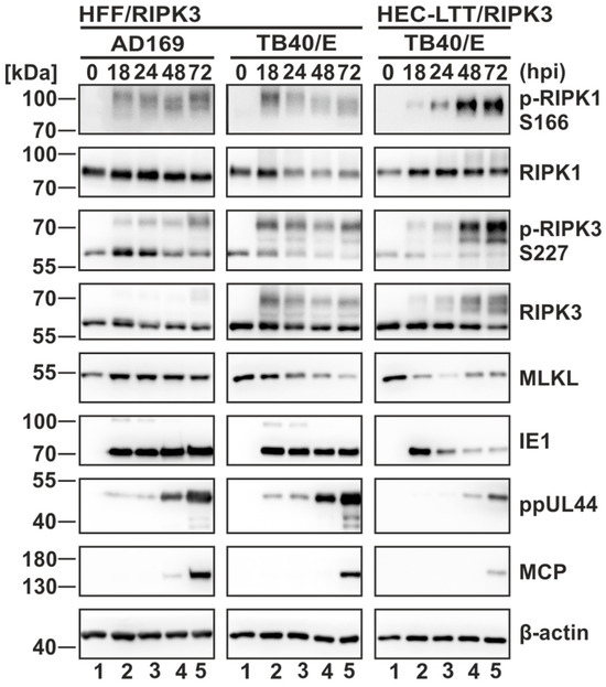 First of all, we established a necroptosis-sensitive cell culture model with HCMV permissive cell lines. Via lentiviral transduction, we restored the expression of the necroptosis-initiating protein RIPK3 in fibroblasts (HFF) and endothelial cells (HEC-LTT). By using a cell viability assay, we showed that the reintroduction of RIPK3 confers the sensitivity to necroptosis, as without RIPK3 expression no significant cell death was induced (Figure 1C). The importance of RIPK3 expression for the execution of necroptosis is reported in several studies, demonstrating that RIPK3 deficiencies are linked to limited necroptosis induction [57,58]. As HCMV has been described to antagonize necroptotic cell death, we expected a modulation of the necrosome complex during infection. This expectation was fulfilled as we observed a massive upregulation of the post-translational modifications (PTMs) of the necrosome components RIPK1 and RIPK3 in Western blot analysis (Figure 2). This modulation can be observed after infection with two HCMV strains (AD169 and TB40/E) and in both cell types (HFF and HEC-LTT). Intriguingly, TB40/E infection resulted in a sharp upregulation of PTMs at 18 hpi in HFF, whereas for AD169-infected cells, a gradually increasing modification over time was observed. Based on this result, we hypothesized that the counteraction of necroptotic cell death is more efficient during TB40/E infection. Of note, we observed a rapid decrease in IE1 levels in HEC-LTT cells. The loss of IE1 expression during infection in HEC-LTT was also detected in our previous studies using this cell line and might be explained by an altered transcriptional regulation or an altered stability of IE1 in HEC-LTT cells compared to HFF cells [39].