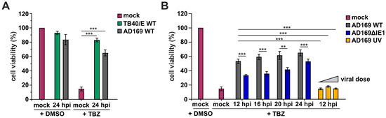 HCMV-mediated rescue from necroptotic cell death begins already at the early stages of infection. HFF/RIPK3 cells were infected for the indicated times and subsequently treated with TBZ for 8 h or with DMSO as control. Cells were infected with TB40/E WT (A), AD169 WT (A,B) and AD169 ΔIE1 (B) at an MOI of 3. AD169 UV (B) was used at increasing viral doses (calculated MOIs of 6, 12 and 18). Necroptotic cell death was monitored by analyzing intracellular ATP levels using a cell viability assay (CellTiter-Glo, Promega, Fitchburg, MA, USA). Red, mock infected cells; green, TB40/E WT infected cells; grey, AD169 WT infected cells; blue, AD169ΔIE1 infected cells; yellow, AD169 UV infected cells. Depicted values (%) represent the mean +/− SD derived from triplicates relative to the control (mock, DMSO). Each experiment was performed two times in independent experiments and one representative experiment is shown. For statistical analysis a student’s t-test was performed (unpaired, two-tailed); ** p < 0.01, *** p < 0.001.