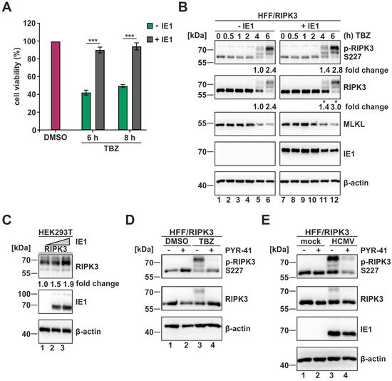 Having shown that the effector protein IE1 is important in counteracting necroptosis during HCMV infection, we next wanted to investigate the impact of IE1 on necroptotic signaling in absence of other viral proteins. Thus, we generated HFF/RIPK3 cells with inducible IE1 expression, in which the expression of IE1 can be stimulated by treatment with doxycycline. To determine whether IE1 expression has a direct effect on the execution of necroptosis, the IE1-inducible cells were treated with TBZ for 6–8 h or DMSO as control, and necroptotic cell death was quantified using a cell viability assay (Figure 4A). While the cell viability was reduced to about 50–60% in cells without IE1 expression (− IE1), IE1 expressing cells were similar to DMSO treated cells (+ IE1). This evident effect highlights the anti-necroptotic activity of IE1, which is exerted independently of other viral proteins. To examine whether IE1 expression directly modulates the necroptotic cascade, the inducible IE1 cells were subjected to TBZ treatment for 0.5–6 h and the levels of RIPK3 and MLKL were examined via Western blot analysis (Figure 4B). For RIPK3, more pronounced modifications were observed in the presence of IE1 (+ IE1) at 6 h post TBZ treatment, while levels of MLKL appeared unaffected by IE1 expression. Simultaneously, a C-terminal deletion mutant of IE1 (IE1 aa1-382) was tested in a similar experimental setup. No altered modification pattern of RIPK3 was detected for this mutant (Figure S2), indicating that the impact on RIPK3 modification is only induced by the full-length version of IE1. Stronger modification of RIPK3 was additionally observed in co-transfection experiments in HEK293T cells, where increasing amounts of IE1 likewise led to an increased modification of RIPK3 (Figure 4C). The modified versions of RIPK3 can be also visualized with a phospho-RIPK3 antibody (Figure 4B), but the upshift of RIPK3 is comparatively strong to result only from phosphorylation events. To analyze whether these slowly migrating bands could be due to the ubiquitination of RIPK3, we included an inhibitor of ubiquitination (PYR-41) in our analysis. By using this inhibitor, the formation of high molecular weight isoforms of RIPK3 could be reduced, both in TBZ treated cells (Figure 4D) and in infected cells (Figure 4E). Since several publications report on the anti-necroptotic effect of RIPK3-ubiquitination [18,19], it appears likely that IE1 interferes with necroptotic signaling by promoting the ubiquitination of RIPK3. Taken together, our data indicate that IE1 exhibits strong anti-necroptotic activity and we provide evidence that IE1 manipulates the modification pattern of RIPK3 during necroptotic signaling.