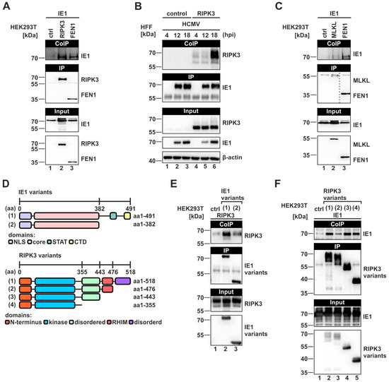 Having identified IE1 as an antagonist of necroptosis, we aimed to investigate whether IE1 directly interferes with the necrosome components to modulate necroptotic signaling. As we observed alterations in the modification pattern of RIPK3 induced by IE1, we first tested whether an interaction between these two proteins can be detected. For that, HEK293T cells were co-transfected with RIPK3 and IE1 constructs and subsequently a co-immunoprecipitation (Co-IP) was conducted. As a positive control, the previously described interaction between IE1 and the flap endonuclease 1 (FEN1) was utilized [37]. As depicted in Figure 5A, upper panel, both FEN1 and RIPK3 were able to co-precipitate IE1. This result suggests that IE1 interferes with early events of necroptotic signaling by interacting with RIPK3. To validate the interaction between RIPK3 and IE1 under infection conditions, HFF/control and HFF/RIPK3 cells were infected with TB40/E at an MOI of 1 for 4–18 h, followed by a Co-IP conducted by precipitating IE1. At 18 hpi, a strong interaction between IE1 and RIPK3 was detected (Figure 5B, upper panel). Some non-specific signals were observed at earlier times of infection. Intriguingly, the IE1-mediated precipitation resulted in the pulldown of modified RIPK3, further emphasizing our previous finding that IE1 promotes the modification of RIPK3. This interaction between IE1 and RIPK3 is particularly interesting, considering that HCMV was reported to lack RHIM-containing proteins [24], and thus far an RHIM-independent interaction with the necrosome has only been described for human gammaherpesvirus 4 (Epstein–Barr virus) [52]. To determine whether IE1 specifically binds to RIPK3, interaction analysis between MLKL and IE1 was performed, but here, no co-precipitation of IE1 could be detected (Figure 5C, upper panel). To further narrow down the interaction interface of IE1 and RIPK3, several truncated variants of these proteins were generated and analyzed in Co-IP experiments (schematic illustration in Figure 5D). We observed that the interaction with RIPK3 depends on the disordered C-terminal domain of IE1, since an IE1 variant lacking the C-terminus (IE1 aa1-382) showed strongly reduced binding to RIPK3 (Figure 5E, upper panel, lane 3). Next, we investigated whether post-translational modifications like SUMOylation or phosphorylation of IE1 are required for the interaction with RIPK3. For this, IE1 was expressed in bacteria and purified as described previously [27]. In Co-IP experiments using purified IE1, we still observed an interaction between RIPK3 and IE1 (Figure 5F, upper panel, lane 2), indicating that this interaction does not depend on IE1 modifications. By analyzing RIPK3 variants with a truncated C-terminus, interactions with IE1 could be detected, although to varying degrees (Figure 5F, upper panel, lanes 3–5). Intriguingly, a strong interaction between IE1 and the RIPK3 mutant aa1-443 (3) was detected. As neither this mutant nor IE1 contains an RHIM domain, these data suggest that the interaction of IE1 and RIPK3 is completely independent of RHIM domains. To sum up, our data provide evidence that IE1 can interfere with necroptotic signaling by binding RIPK3 in an RHIM-independent manner.