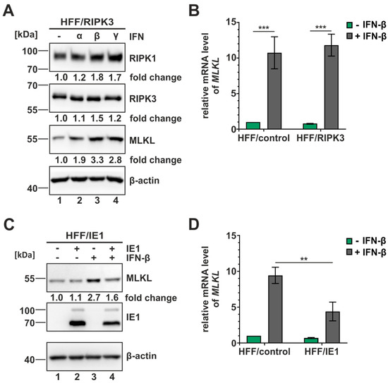 Increasing evidence suggests a crucial role of interferon (IFN) signaling in the activation of necroptotic cell death. Several components of the necroptotic pathway, including MLKL, have been described to be upregulated by IFN treatment and generally, the IFN-homeostasis appears to be of high importance for the efficient execution of necroptosis [53,54]. Since IE1 is a known inhibitor of IFN signaling, it was tempting to speculate that this activity contributes to the inhibition of necroptosis in an indirect manner [32]. To address this hypothesis, we first analyzed whether we can detect the IFN-mediated upregulation of MLKL and other necrosome components in our necroptosis-sensitive cell system. Therefore, we stimulated the HFF/RIPK3 cells with different types of IFN (IFN-α, -β, -γ) for 24 h and subsequently harvested and analyzed the samples in Western blot (Figure 6A). Interestingly, we observed an upregulation of all necrosome components after the treatment with all three types of IFN. The strongest effect was detected for MLKL after IFN-β stimulation, with a fold change of 3.3. Next, we investigated whether this upregulation can also be detected on a transcriptional level. Therefore, total RNA was isolated after IFN-β stimulation (24 h), followed by quantification of the MLKL mRNA levels using RT-qPCR. In HFF/control as well as HFF/RIPK3, a significant upregulation of MLKL levels upon IFN-β stimulation was monitored (Figure 6B). After confirming the positive effect of IFN-β stimulation on MLKL levels, we examined the influence of IE1 expression in this context. For that, the inducible IE1 cells were utilized and stimulated with IFN-β for 24 h. Subsequently, the levels of MLKL were analyzed on protein and transcriptional levels by performing Western blot experiments and RT-qPCR, respectively (Figure 6C,D). In the presence of IE1, a diminished MLKL induction of approx. 50% was detected, both on the protein level (Figure 6C) and on transcriptional level (Figure 6D), indicating that IE1 is capable of antagonizing the IFN-mediated upregulation of MLKL. These observations suggest that IE1 plays a dual role in the antagonism of necroptotic cell death. On the one hand, it directly affects RIPK3, but on the other hand, it indirectly modulates the expression of MLKL.
