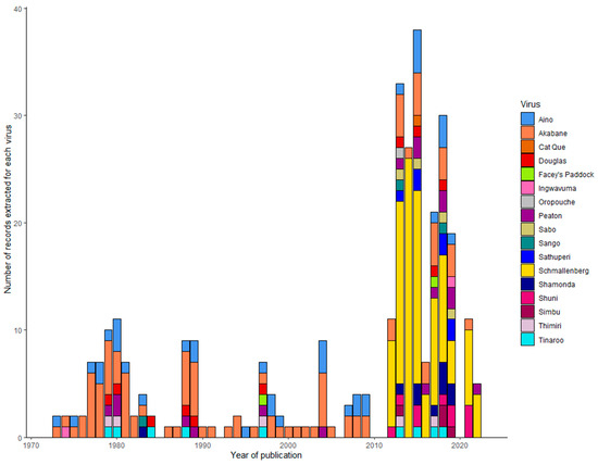 - Screening by title and keywords for eligible publications relevant to the 33 viruses of the Simbu group and by title and abstract for domestic ruminant, equid, or porcine species.