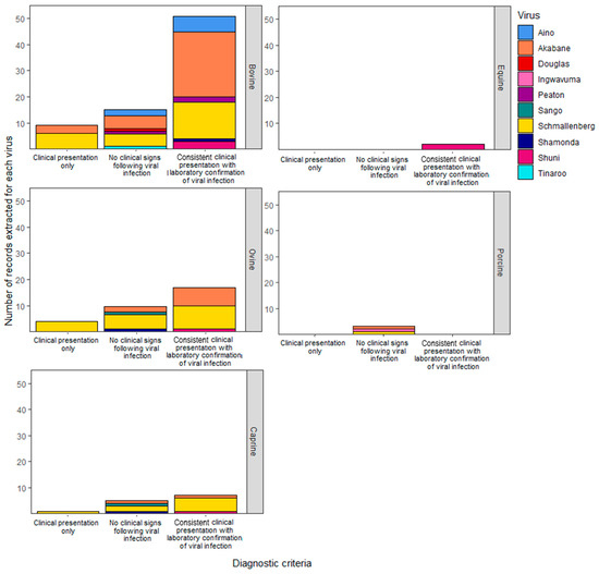 - Animal disease presentation, which recorded observations of clinical signs associated with SGVs. An assessment was completed to ensure that cases of clinical disease described were confirmed to be a result of infection with the virus of interest. The diagnostic criteria are based on the unified case definitions proposed by European agencies during data collection for the Schmallenberg virus epidemic [21]. The criteria for case definition were as follows: