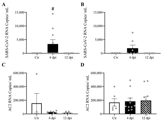 We previously reported significant levels of SARS-CoV-2 RNA in the lungs and cardiac muscle of cats [13]. Here, we reported that delta SARS-CoV-2 RNA was also detectable in skeletal muscle (p = 0.0477) and pancreas (p = 0.13) at 4 dpi (Figure 2A,C). No statistically significant change in ACE2 expression was observed in any of these tissues following SARS-CoV-2 infection (Figure 2B,D). A very low level of viremia was detected via TCID50 (e.g., 3.16 × 102 TCID50/mL) at 4 dpi in infected feline plasma.