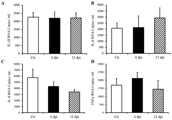 Since we detected SARS-CoV-2 RNA in the pancreas at 4 dpi and observed decreased insulin secretion at 12 dpi, we investigated whether SARS-CoV-2 infection could lead to the destruction of pancreatic beta cells in our feline model. To this end, histopathology and immunofluorescence assays were performed on the pancreas using anti-insulin antibodies to identify beta cells of the pancreas. Following imaging and blind scoring of both the number of cells within the beta islets (Figure 3A) and fluorescent intensity (Figure 3B), we did not observe a decreased number of beta cells or reduced insulin production. Histological changes were also not observed in the pancreas of infected cats as compared with sham-inoculated controls, with the exception of one cat that exhibited mild lymphoplasmacytic inflammation affecting one pancreatic islet at 12 dpi (Figure S1). We also quantified pro-inflammatory cytokines in the pancreas using ddPCR; however, we did not observe any increase in IL-1β, IL-6, IL-8, or TNFα RNA levels at 4 or 12 dpi (Figure 4A–D).