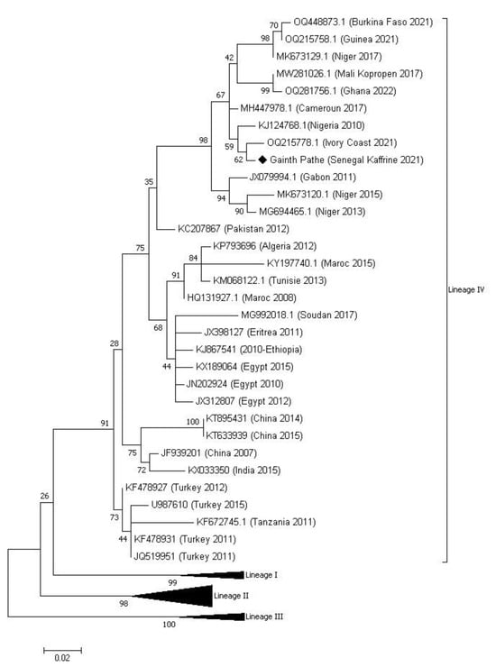 Phylogenetic tree from the partial sequences of the N gene of the PPRv constructed using the likelihood method (ML) following the two-parameter Kimura model. The sample isolated in this study is indicated on the tree with a black diamond with the name of the sampling location (Gainth Pathé), the country (Senegal), and the year of sampling (2021). Numbers at nodes are Bootstrap values obtained from 1000 repetitions. The sequences of lineages I, II and III have been collapsed in this figure for greater clarity.