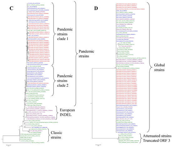 Phylogenetic analyses were performed based on the alignment of 83 PEDV sequences. A tree was constructed from the complete genome, which allowed the identification of a clade of pandemic strains. The pandemic strains were divided into two clades: clade one, including 20 Mexican clades collected between 2013 and 2017, and clade two, including the PEDV/MEX/SON/01/2015 strain. Three strains from this study are within the INDEL clade, related to two subclades. This analysis showed that the Poltatova01/2014 strain from Ukraine gave rise to a subclade that included five Mexican strains that caused PEDV outbreaks between 2015 and 2017, indicating that there was probably an entry of European PEDV strains into Mexico or that genetic mutations were the same in these regions (Figure 2A). The phylogeny of the S glycoprotein corroborates that the first outbreaks in Mexico were related to USA-origin strains and that the INDEL strains have been circulating in Mexico since 2013 (Figure 2B). Due to the deletions in the ORF1a region in three Mexican strains, we studied the phylogeny of polyprotein 1a, and we observed that these strains are located in a subclade together with another Mexican strain that does not have deletions in this region. However, the strains are genetically distant from the attenuated vaccinal Asian strains. This same analysis allowed the identification of the pandemic clades. Strain PEDV/MEX/SON/01/2015 is located in subclade two, together with a pair of Mexican strains reported in 2014 (KJ645700 and KR265766) and a Canadian strain from Quebec (KR265831), according to the analysis of the complete genome (Figure 2C). The analysis of ORF3 classified PEDV into two main clades, which grouped the attenuated Asian PEDV strains into one clade corresponding to strains with a truncated ORF3 protein (Figure 2D).