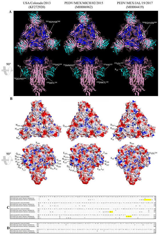 Model of the PEDV S protein trimer and amino acid alignment. (A) Model of the secondary structure of the S glycoprotein. Blue corresponds to the COE region and cyan to domain A. In strain PEDV/MEX/JAL/19/2017, the insertion 232LGL234 is shown in red, the epitope SS” is shown in green, and SS6 is shown in yellow. (B) The trimeric structure of the S glycoprotein surface, where the electrostatic potential and the significant changes among the prototype strain (USA/Colorado/2013), the Mexican INDEL strain (PEDV/MEX/MICH/02/2015), and a 2017 Mexican pandemic strain (PEDV/MEX/JAL/19/2017) are shown. (C) Alignment of amino acids of the domain A region. (D) Alignment of amino acids of the COE region. Insertions and deletion are marked in yellow.