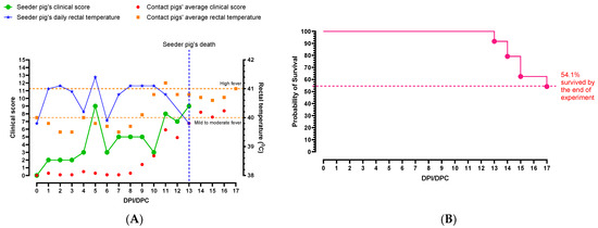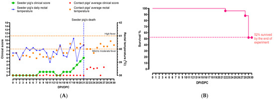Summary of (A) clinical parameters and (B) survival percentages of pigs infected with CSFV Pinillos. The seeder pig’s rectal temperature started increasing after 4 dpi, and fluctuated throughout the study. The highest rectal temperature (40.8 °C) of the seeder pig was observed on 18 dpi. The average rectal temperature of the pen started rising on 14 dpi, and fluctuated until the end of the study. The seeder pig was euthanized on 21 dpi as it reached the humane endpoint. The clinical score of the pen remained low until the seeder pig was euthanized on 21 dpi, and slightly increased after. Average rectal temperatures of contact animals are presented for clarity. By the end of the experiment, 52% of the animals survived and some showed signs of recovery.