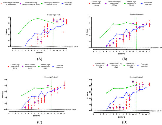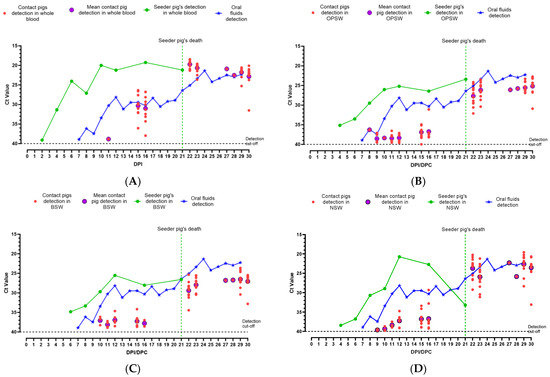 In contact pigs, CSFV genomic material was first detected in OPSW (Ct = 38.36) on 4 dpc (Figure 4B). Thereafter, the CSFV genome was detected in one NSW (Ct = 37.73), seven BSW (Ct = 37.35–39.01), and eight OPSW (Ct = 37.33–39.06) samples (out of the twelve pigs sampled) on 5 dpc (Figure 4B–D). Starting 8 dpc, the CSFV genome was detected in OPSW samples collected from all pigs, and after 10 dpc, all three swab samples from all contact pigs tested positive for CSFV genomic material.