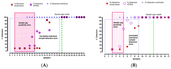 Estimation of percentage detection of CSFV genomic material in aggregate oral fluid samples and individual whole blood samples. (A) CSFV Pinillos; (B) CSFV Koslov. After its first detection in oral fluids, CSFV genomic data remained at 100% detection throughout the study. Percent detection of CSFV genomic material in individual blood and oropharyngeal swab samples remained lower than 100% for many days afterward (Unreliable individual sample detection zone). Seeder pig positive zone = the period when only the seeder pig was viremic.