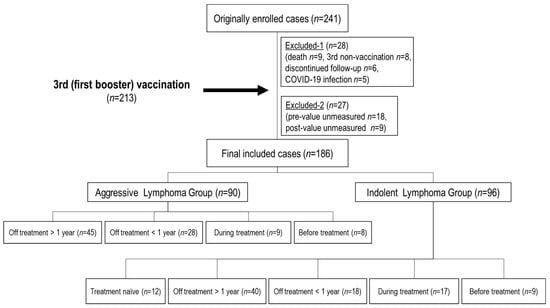 Chicago/Turabian StyleSaito, Makoto, Akio Mori, Takashi Ishio, Mirei Kobayashi, Shihori Tsukamoto, Sayaka Kajikawa, Emi Yokoyama, Minoru Kanaya, Koh Izumiyama, Haruna Muraki, and et al. 2024. "Initial Efficacy of the COVID-19 mRNA Vaccine Booster and Subsequent Breakthrough Omicron Variant Infection in Patients with B-Cell Non-Hodgkin’s Lymphoma: A Single-Center Cohort Study" Viruses 16, no. 3: 328. https://doi.org/10.3390/v16030328