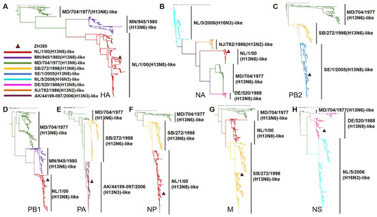 Phylogenetic analysis of H13 AIVs. Phylogenic trees of the (A) HA, (B) NA, (C) PB2, (D) PB1, (E) PA, (F) NP, (G) M, and (H) NS genes. The phylogenic trees were built using the maximum-likelihood method with rapid bootstrap replicates using FastTree v2.1.11. The nine bars represent the groups of the viruses. The different colors represent different groups. Viral groups and their representatives: NL/1/00(H13N8)-like, A/black-headed gull/Netherlands/1/00(H13N8); MN/945/1980(H13N6)-like, A/gull/Minnesota/945/1980(H13N6); MD/704/1977(H13N6)-like, A/gull/Maryland/704/1977(H13N6); SB/272/1998(H13N6)-like, A/duck/Siberia/272/1998(H13N6); SE/1/2005(H13N8)-like, A/black-headed gull/Sweden/1/2005(H13N8); NL/5/2006(H16N3)-like, A/European herring gull/Netherlands/5/2006(H16N3); DE/520/1988(H13N9)-like, A/ruddy turnstone/Delaware Bay/520/1988(H13N9); NJ/782/1986(H13N2)-like, A/herring gull/NJ/782/1986(H13N2); and AK/44199-097/2006(H13N3)-like, A/glaucous gull/Alaska/44199-097/2006(H13N3). ZH385 is labeled with a triangle in the phylogenic trees.