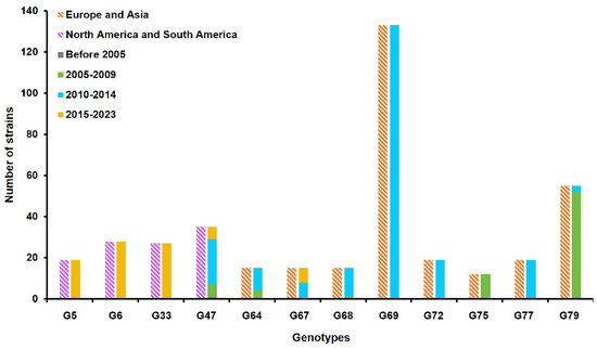 On the basis of the full genomic diversity, the 550 H13 AIVs were divided into 81 different genotypes (Supplementary Table S2). Among the 81 genotypes, 12 genotypes, including genotype 5 (G5), 6 (G6), 33 (G33), 47 (G47), 64 (G64), 67 (G67), 68 (G68), 69 (G69), 72 (G72), 75 (G75), 77 (G77), and 79 (G79), possessed more than ten strains. According to the geographical distribution of these 12 genotypes, the G5, G6, G33, and G47 viruses were mainly prevalent in North America and South America, whereas the G64, G67, G68, G69, G72, G75, G77, and G79 viruses were prevalent in Europe and Asia (Figure 2). Since 2015, the G5, G6, G33, G47, and G67 genotypes have become more prevalent, while the ZH385 virus belonged to G68. The above results demonstrated that the circulating H13 AIVs had undergone complex genomic reassortment events.