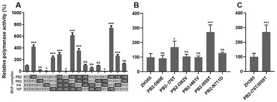 Polymerase activity of recombinant and mutant ZH385 in HEK293T cells. (A) Polymerase activity of the 16 RNP combinations between ZH385 (H13N8) and CKLN07 (H9N2). Segments derived from ZH385 and those derived from CKLN07 are denoted by H13 and H9, respectively. (B,C) Polymerase activity of the ZH385 PB2 mutants. Values shown are means ± SDs from triplicate transfections. The significance of polymerase activity was compared with that of ZH385. Statistical analysis between different groups was performed by using a one-way analysis of variance (ANOVA) test. * (p < 0.05), *** (p < 0.001), and ns (p > 0.05).