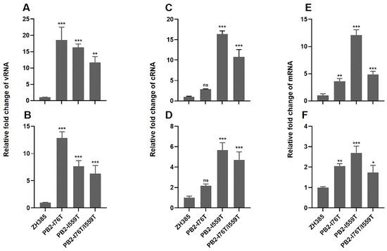 Replication and transcription of the ZH385 PB2 mutants in MDCK cells. (A,B) The levels of vRNA, (C,D) cRNA, and (E,F) mRNA of the ZH385 PB2 mutants. The levels of RNA were determined by qRT-PCR in MDCK cells that were infected for 6 h (A,C,E) and 8 h (B,D,F) with the ZH385 PB2 mutants and normalized to the GAPDH level. The values were standardized to the ZH385, and the values shown are means ± SDs from triplicate infections. Statistical analysis between different groups was performed by using a one-way analysis of variance (ANOVA) test. * (p < 0.05), ** (p < 0.01), *** (p < 0.001), and ns (p > 0.05).