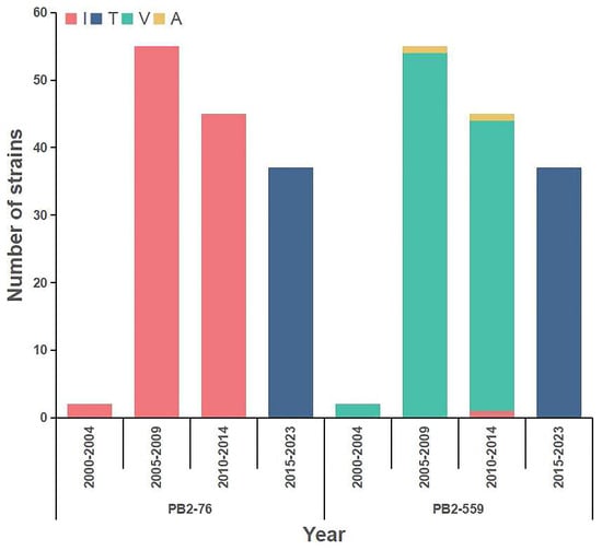 3.6. PB2-I76T and PB2-I559T Mutations Were Prevalent in H13N8 AIVs Isolated in Recent Years
