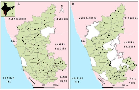 The location of surveyed epidemiological units (villages) for collection of serum samples are depicted (as filled square) in the GIS Map of the Karnataka state, India. (A) Survey for prevalence/immunity status of PPR before implementation of mass vaccination, Red box in India map indicated the location of the studied state (B) Survey for post-vaccination sero-monitoring of PPR.