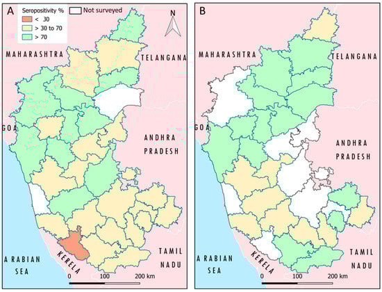 Distribution of PPRV antibody prevalence in small ruminants across various epidemiological units in different districts in Karnataka state, India. (A) Immunity status before implementation of mass vaccination (B) Post-vaccination immunity status. The districts shown in white indicate no sampling in that district.