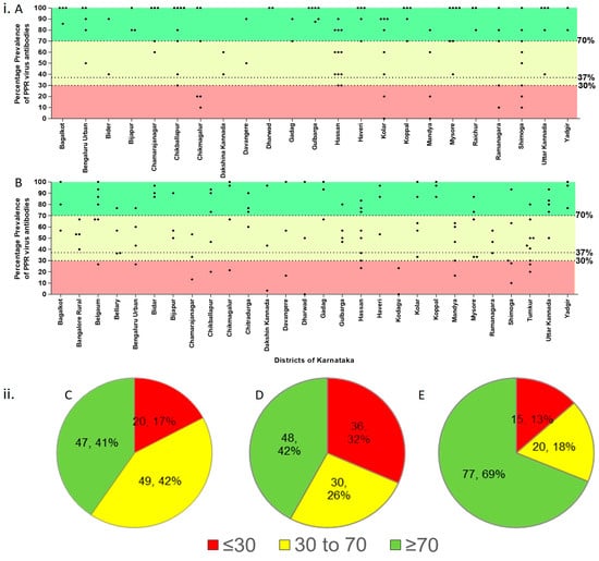 Distribution of epi-units based on percent positivity levels of PPRV antibodies in the studied state. (i) Frequency prevalence percentage of epi-units in different districts in Karnataka. (A) Prevalence/immunity status before implementation of mass vaccination, (B) Post-vaccination sero-monitoring. (ii) Distribution of epi-units based on percent positivity levels (C) Prevalence/immunity status before mass vaccination in all three age groups. (D) Prevalence/immunity status in the 6–12 months age group before vaccination (E) Post-vaccination sero-monitoring prevalence status in the 6–12 months age group.