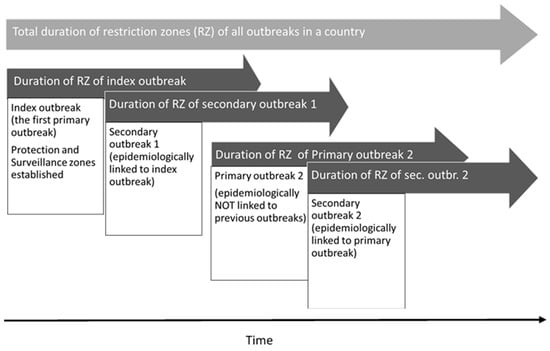 Index outbreak: A primary outbreak occurring during the period when no ASF protection or surveillance zone is present in any region of the country. To determine whether an outbreak farm is a new index outbreak or a new primary outbreak, we checked whether any restriction zones were present in any part of the country at the time the outbreak was confirmed. If no restriction zones were in place, it was considered to be an index outbreak (Figure 1).