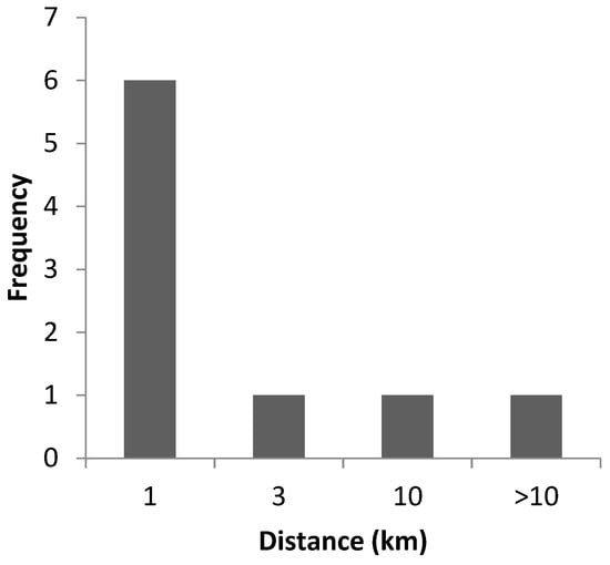 The mean distance of secondary outbreaks from primary outbreaks was 5.3 km, with a median of 0.8 km (minimum 0.02 km and maximum 33 km) (Figure 3).