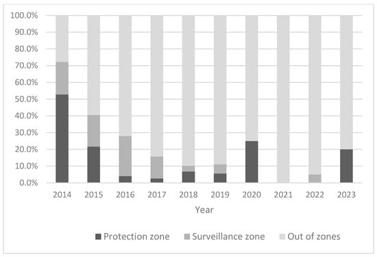 Data on the distribution of outbreaks between zones detected after the index case by country in different years are presented in Table 2. In total, 14.9% (n = 37) of all outbreaks following the index outbreak in all years and countries were detected within one of the established protection zone, 11.7% (n = 29) in one of the established surveillance zone and 73.4% (n = 246) outside the borders of any existing surveillance zones. The proportions observed varied between years and countries (Figure 4 and Table 2). The detection rate of outbreaks within existing restricted zones was the highest in 2014, when 72.2% of all outbreaks were detected in protection (52.8%) or surveillance zones (19.4%). However, this was strongly influenced by the situation in Latvia in 2014, where several outbreaks were detected in closely located smallholder pig farms. Furthermore, the protection and surveillance zones established in 2014 in Latvia exceeded the minimum radii of 3 km and 10 km, respectively, and were set along the boundaries of administrative units of the affected area. Since 2015, the detection rate of outbreaks within existing restriction zones has been below 50%.