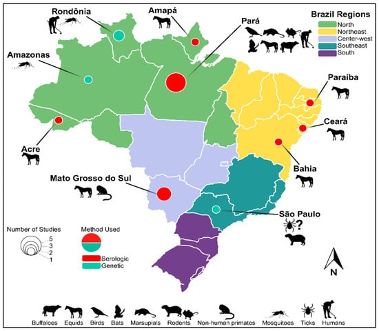 Geographic range and epidemiological landscape of Cacipacoré virus. Brazilian states with evidence of CPCV circulation are named. Hosts from which CPCV and/or antibody have been identified within a given Brazilian state are indicated by representative graphic(s). Pie charts within a given state indicate the number of studies identifying CPCV by size and the method of identification by color.