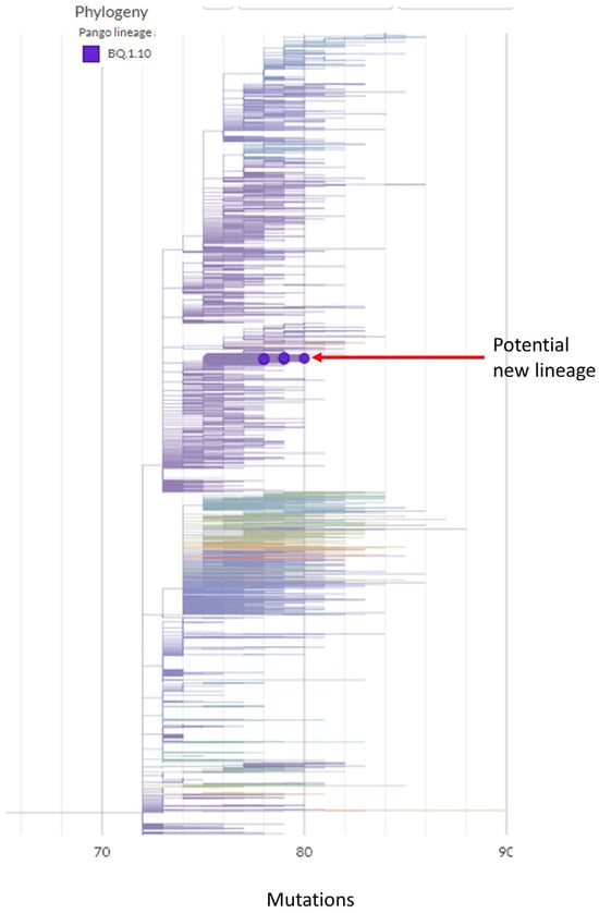 Phylogenetic tree of 13 potential new lineage samples. Relative position of potential new lineage amongst the global samples, obtained from Nextstrain (https://nextstrain.org/fetch/genome.ucsc.edu/trash/ct/subtreeAuspice1_genome_392fc_7cfc90.json?f_userOrOld=uploaded%20sample; accessed on 2 January 2024).