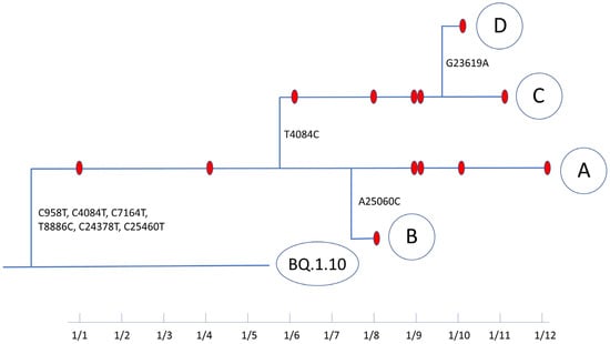 We tracked the probable evolutionary path of BQ.1.10.DM over a 12-day period based on sequence changes and sample collection dates (Figure 4). In addition to the six characteristic mutations apart from the parental lineage, BQ.1.10.DM acquired three additional mutations in ORF1a and Spike protein along the transmission path. The 13 BQ.1.10.DM samples were divided into 4 groups, A–D based on the sequences. Within Group A, two branches formed: a mutation in Spike L1166F (A25060C) in the HR2 domain to form Group B and a reversion synonymous mutation from C4084T to T4084C to form Group C. Besides these two mutations, five viral transmissions occurred without any mutational changes. In Group C, a branch formed with an additional mutation in Spike S686N (G23619A) at the S1/S2 cleavage site to form Group D. Four transmission events occurred without mutation changes within this branch. There is no report or implication about the role of these two nonsynonymous mutations acquired by BQ.1.10.DM along its transmission path in virus properties. Since BQ.1.10.DM acquired 3 mutations during a 12-day period and the genome size of SARS-CoV-2 is 29.9 kb, the evolutionary rate of BQ.1.10.DM can be calculated as 3.05 × 10−3 subs/site/year.