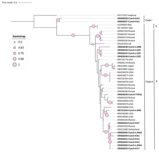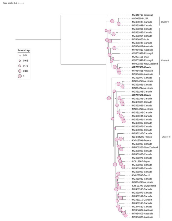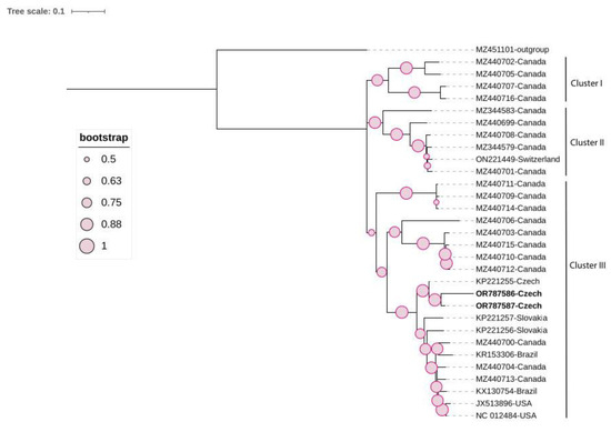 The ML phylogenetic tree was constructed using the General Time Reversible model based on the complete genome. It showed the presence of three clusters: I, II, and III. The two Czech molecular variants of GRVF clustered differently (Figure 4). The first isolate (OR787589) belonged to Cluster II, while the second isolate (OR787588) was a member of Cluster III. The pairwise nucleotide identity between both Czech molecular variants was low, at 80.5% (Figure S2).