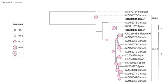 The ML phylogenetic tree was generated with the general time-reversible model substitution model with Gamma distribution (GTR+G) based on a complete genome (Figure 3). The tree shows two clades; Clade I includes two isolates, one of Czech origin (OR787584) and the other of Canadian origin (MZ451070); they share 97% pairwise similarity (Figure S1). Clade II consists of two sub-clades, A and B. The second sequence (OR787585) isolated from the same plant (TI23) clustered with a Spanish isolate (KX171167) in Sub-clade A, sharing 97.2% pairwise similarity. Both sequences are recombinants, as previously mentioned. The two molecular variants (OR787584 and OR787585) exhibited a high degree of variation (17.5%) calculated based on the complete coding region (Figure S1).