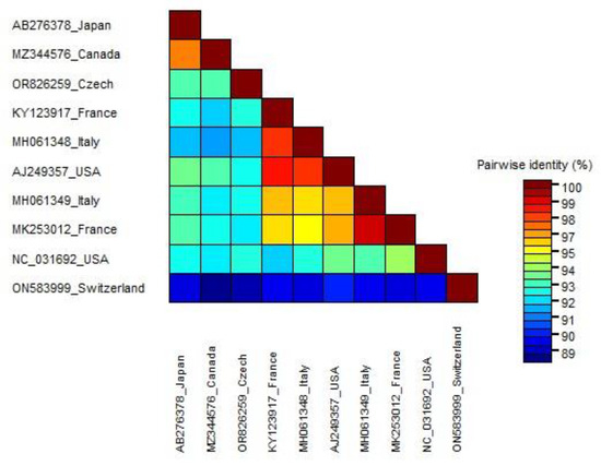 The Sequence Demarcation Tool (SDTv1.2) and BioEdit software were used to determine the pairwise identity and sequence similarities between the Czech isolates and other NCBI-retrieved sequences within each dataset [47,50].