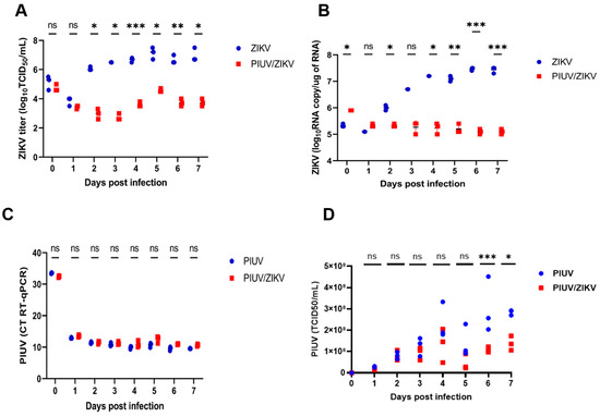 PIUV reduces ZIKV titer in C6/36 cells (ZIKV and PIUV both at MOI 0.1). (A) ZIKV TCID50 titers in the “ZIKV-only” and “ZIKV and PIUV coinfection” wells. (B) ZIKV RNA copy number “ZIKV-only” and “ZIKV and PIUV coinfection” wells. (C) Threshold cycle (CT) of PIUV (RT-qPCR), comparing “PIUV-only” and “ZIKV and PIUV coinfection” wells. (D) PIUV TCID50 titers in the “PIUV only” and “ZIKV and PIUV coinfection” wells. ns: not significant (p ≥ 0.05); *: significant (p 0.01 to 0.05), **: very significant (p 0.001 to 0.01), ***: extremely significant (p 0.0001 to 0.001).