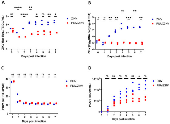 PIUV reduces ZIKV titer in C6/36 cells (ZIKV at MOI 1 and PIUV at MOI 0.1). (A) ZIKV TCID50 titers in “ZIKV-only” and “ZIKV and PIUV coinfection” wells. (B) ZIKV RNA copy number in “ZIKV-only” and “ZIKV and PIUV coinfection” wells. (C) Threshold cycle (CT) of PIUV (RT-qPCR), comparing “PIUV-only” and “ZIKV and PIUV coinfection” wells. (D) PIUV TCID50 titers in the “PIUV only” and “ZIKV and PIUV coinfection” wells. ns: not significant (p ≥ 0.05); *: significant (p 0.01 to 0.05), **: very significant (p 0.001 to 0.01), ***: extremely significant (p 0.0001 to 0.001), ****: extremely significant (p < 0.0001).