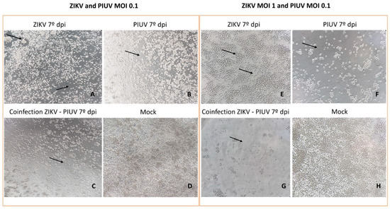 Infected C6/36 cells showing cytopathic effect (CPE) (black arrow) and mock-challenged cells. (A–D) ZIKV and PIUV MOI 0.1. (A) Cells infected with ZIKV (7° dpi.), presenting more prominent clumps of cells and cell destruction (100×). (B) Cells infected with PIUV (7° dpi.), showing considerable dead cells and spaces between cells (100×). (C) Cells coinfected with ZIKV and PIUV (7° dpi.), displaying the evolution of the cell death and destruction of the monolayer (100×). (D) Mock-challenged cells (100×). (E–H) ZIKV MOI 1 and PIUV MOI 0.1. (E) Cells infected with ZIKV (7° dpi.) (showing the evolution of the CPE) (200×). (F) Cells infected with PIUV (7° dpi.) (showing the evolution of the CPE) (200×). (G) Cells coinfected with ZIKV and PIUV (7° dpi.) (showing the evolution of the CPE) (200×). (H) Mock-challenged cells (200×).